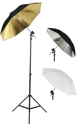 Reflective umbrellas are pointed in the opposite direction. The light hits the reflective surface of the umbrella — usually silver or white. Then it bounces back on the subject.